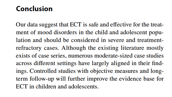 ECT is underutilized in children and adolescents with severe mood disorders; having this compilation of case studies is very helpful to demonstrate a firm evidence base for efficacy and safety. Child and adolescent psychiatrists in general are still poorly educated about ECT and not very accepting of it as a group. This article, published in a high impact factor journal, is a good step towards educating this segment of our colleagues.