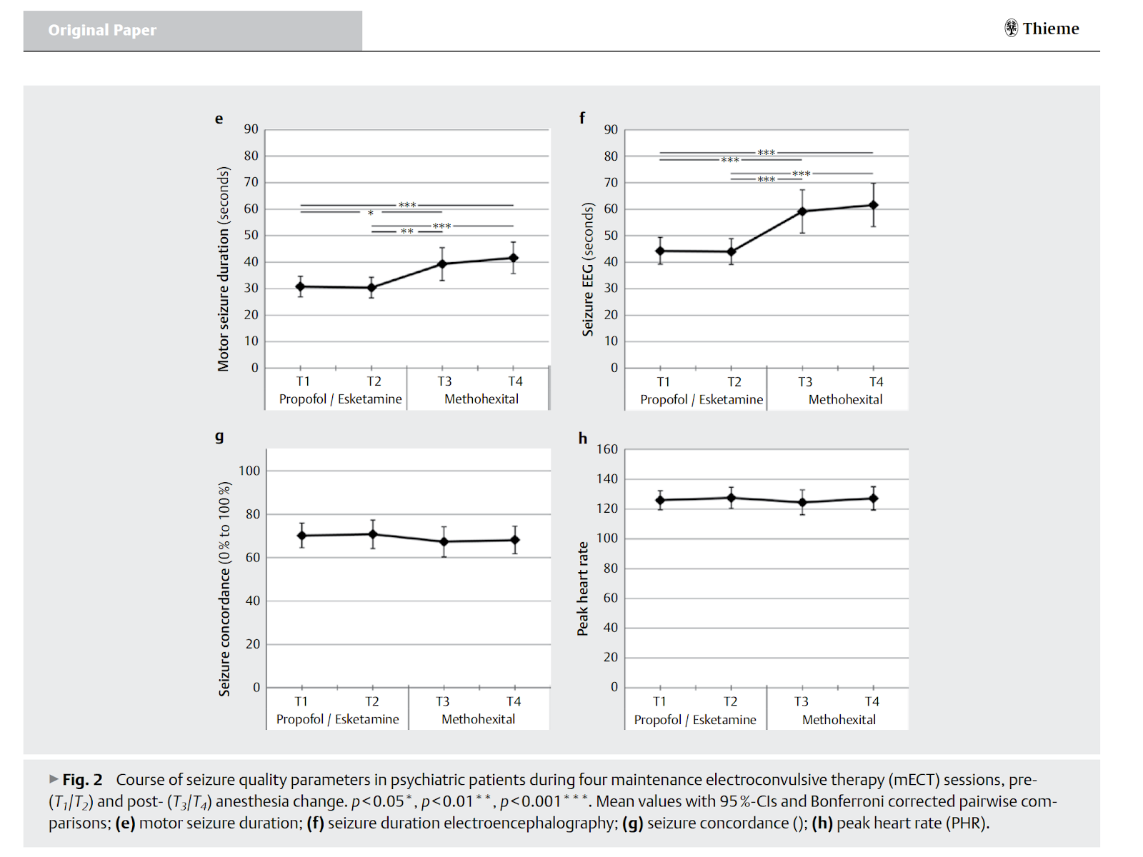 Here is a data-packed paper that will appeal to followers of the ECT anesthesia literature. It's a fun read, but comes up short on major conclusions. Both methohexital and the propofol/esketamine combination have their plusses and minuses. And without clinical correlation, these data are just technically interesting. Finally, the double output of European ECT devices means the stimulus doses are much higher than in the USA, limiting generalizability.
