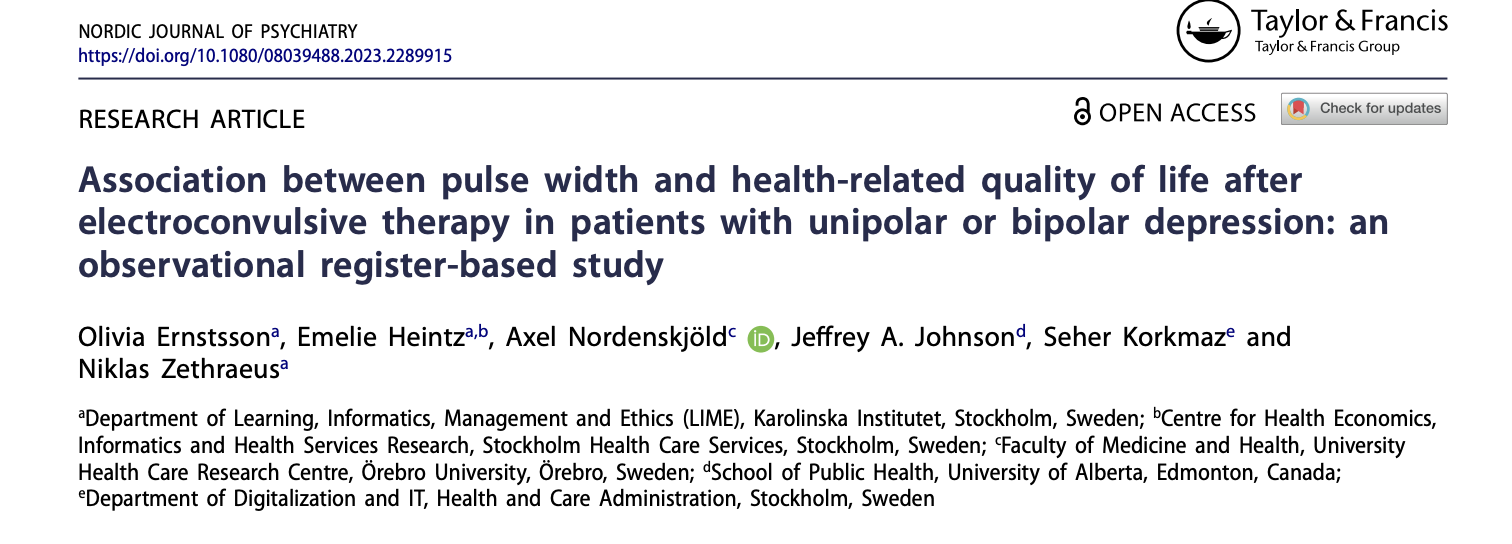 Association between pulse width and health-related quality of life after electroconvulsive therapy in patients with unipolar or bipolar depression: an observational register-based study.Nord J Psychiatry. 2023 Dec 11:1-9. doi: 10.1080/08039488.2023.2289915. Online ahead of print.