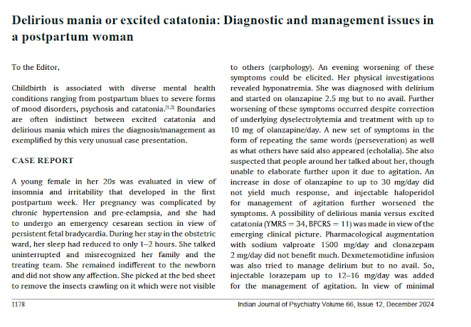 Out on PubMed, from clinicians at Duke, is this case report: Misdiagnosis of Primary Eating Disorder in an Individual With Major Depressive Disorder and Comorbid Catatonic Syndrome. Howard A, Robbins-Welty G, Schindler NJ, Kincaid B, Komisar J. J Psychiatr Pract. 2024 Nov 1;30(6):447-448. doi: 10.1097/PRA.0000000000000825. PMID: 39655974 The abstract is copied below: Catatonia is a neuropsychiatric syndrome affecting movement, emotion, speech, and behavior, which commonly occurs secondary to medical or psychiatric disorders and with comorbid illnesses. We report the case of an 18-year-old male with a history of depression, anxiety, attention-deficit/hyperactivity disorder, polysubstance use, and previous suicide attempts who presented to the hospital from a residential eating disorders treatment facility, due to psychomotor slowing. The patient scored 3 or lower on the Bush-Francis Catatonia Rating Scale (BFCRS), but he showed marked improvement following 2 mg of intravenou...