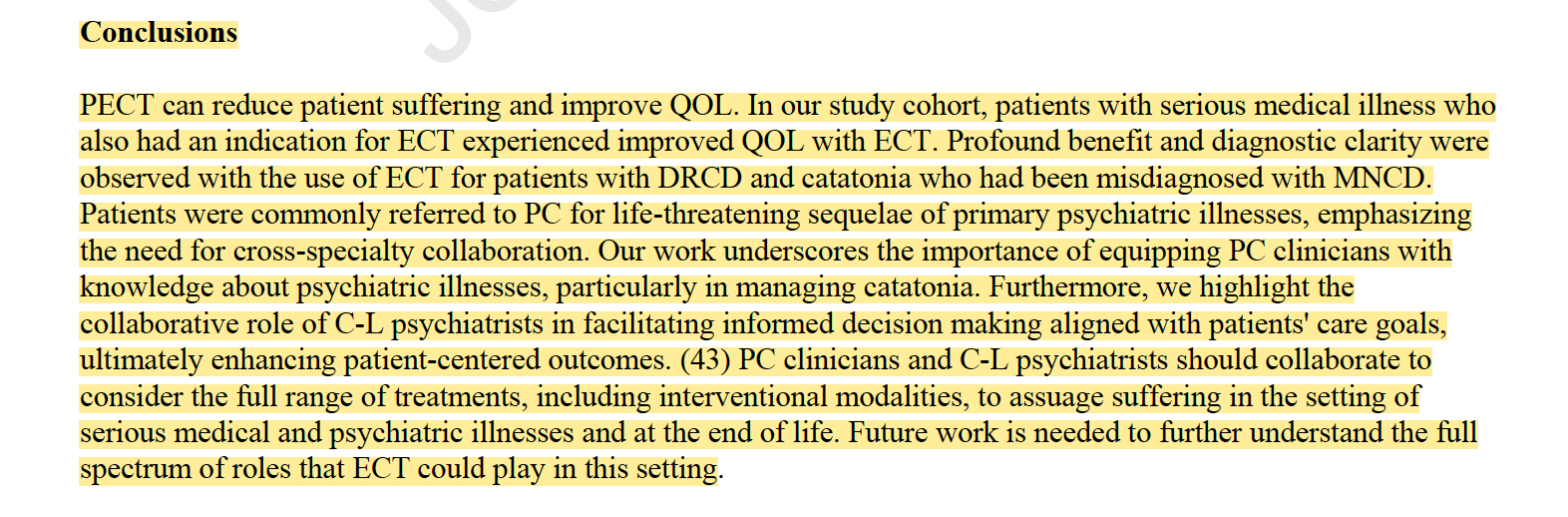 The abstract is copied below:Introduction: Palliative care (PC) is the standard of care for patients with serious medical illnesses, or those conditions associated with high risk of mortality and negative impact on quality of life (QOL). Electroconvulsive therapy (ECT) is the gold standard treatment for certain psychiatric conditions, which may co-occur with serious medical illnesses. However, the use of "palliative ECT" (PECT) in this context is understudied.